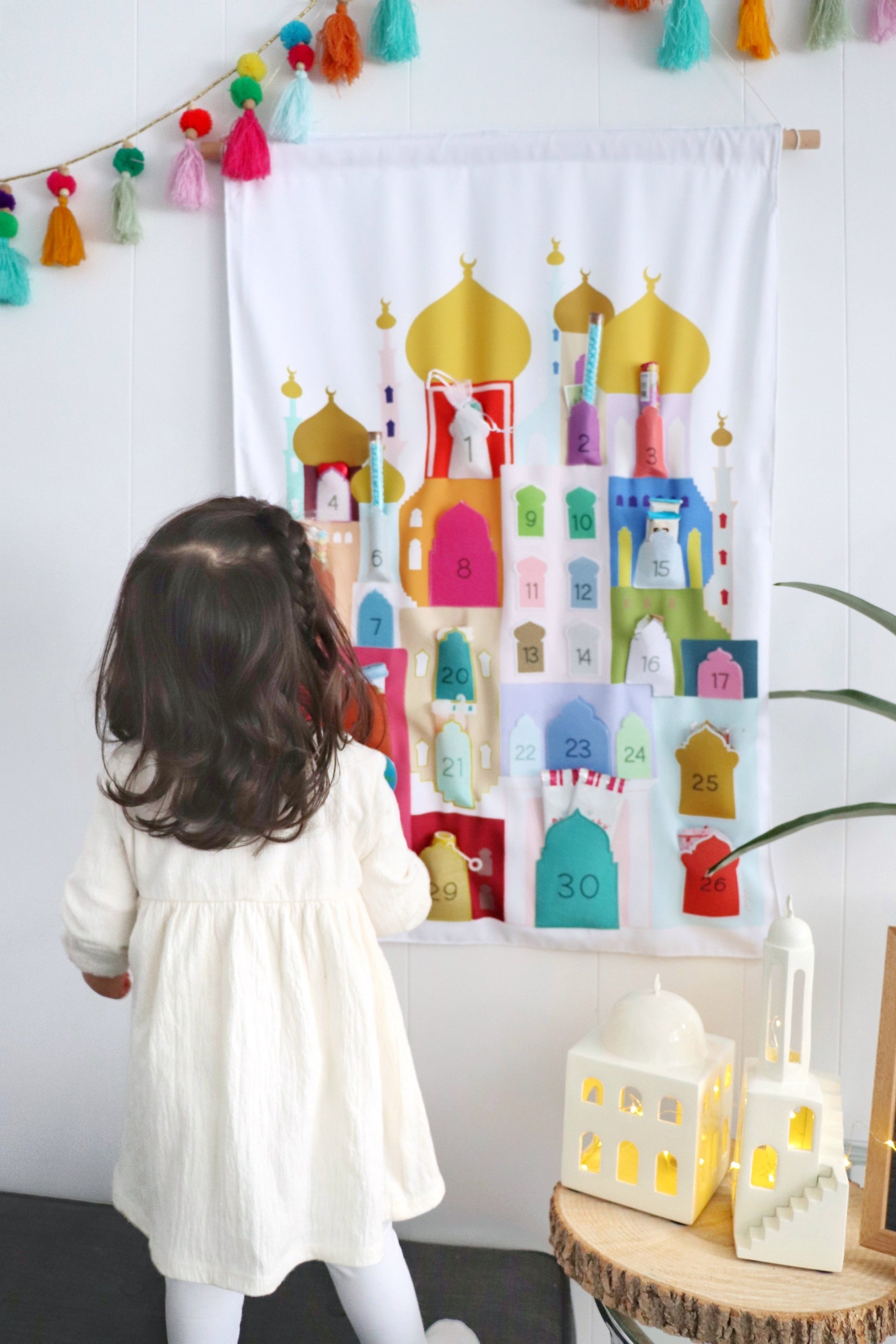 2. 4 piece value bundle includes; Multicolour Ramadan Calendar + Camel Activity Basket + Multicolor Tassels +Ramadan / Eid Mubarak DIY Felt Banner.