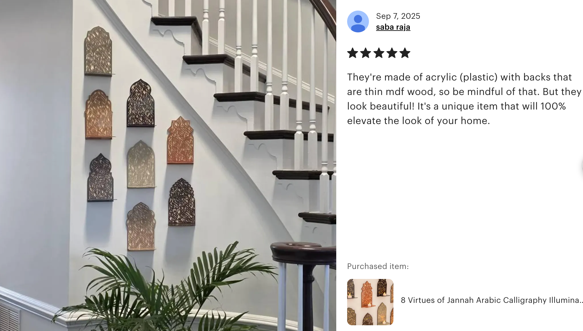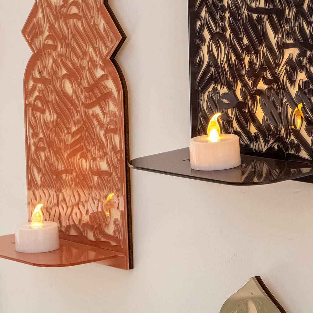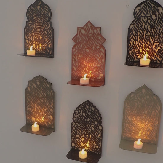 Elevate your space with the timeless elegance of our 8 Virtues of Paradise Arabic Calligraphy Tea-light Wall Decor. Inspired by Islamic heritage, each piece is intricately designed with Arabic calligraphy by talented artist Zakera and crafted to hold a glowing tea-light shelf wall art.