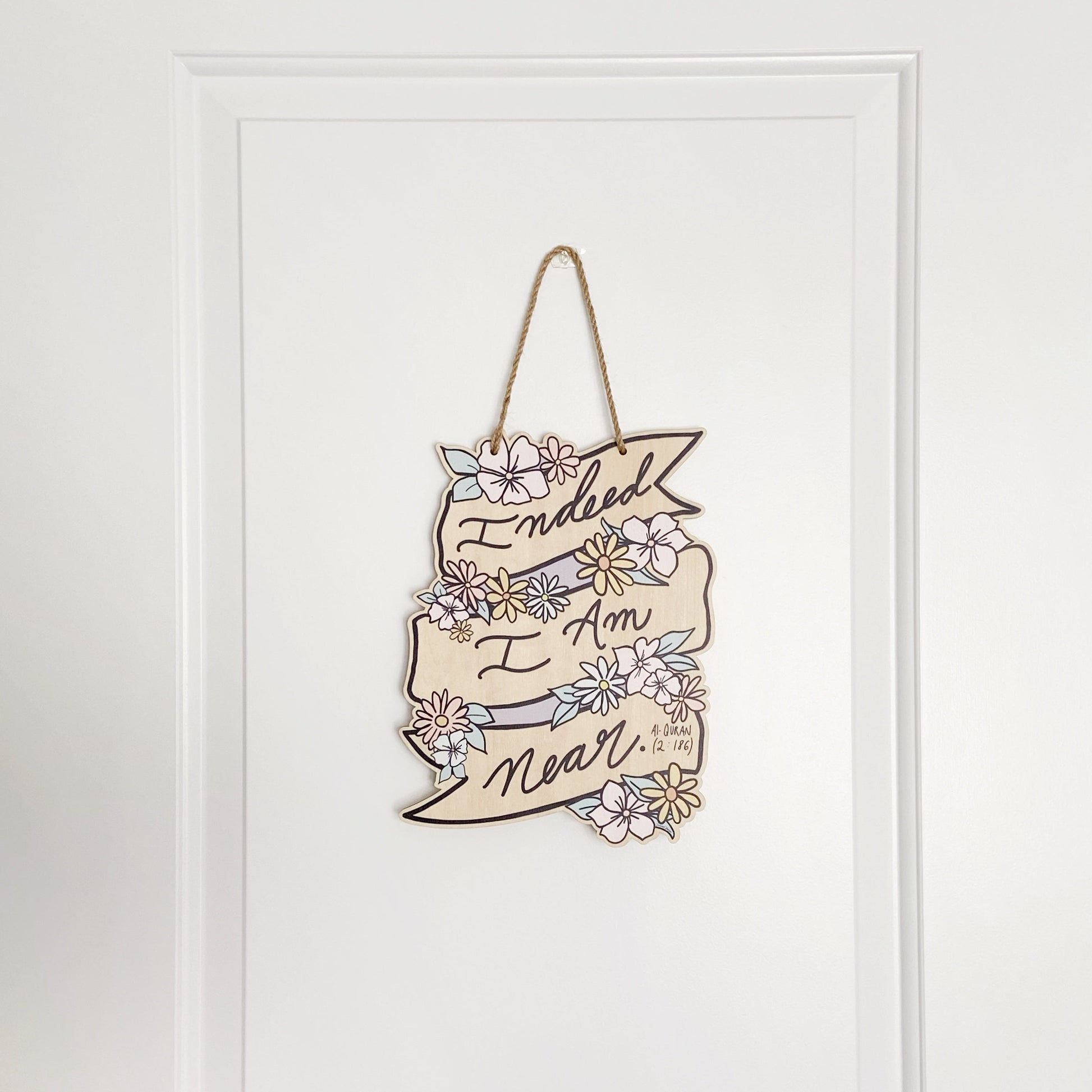This piece features bold, lighthearted florals that bring a fresh, hand-drawn energy to a modern and striking design. The phrase “Indeed I Am Near” (2:186) carries a timeless and powerful message, serving as a meaningful daily reminder that you are never truly alone.