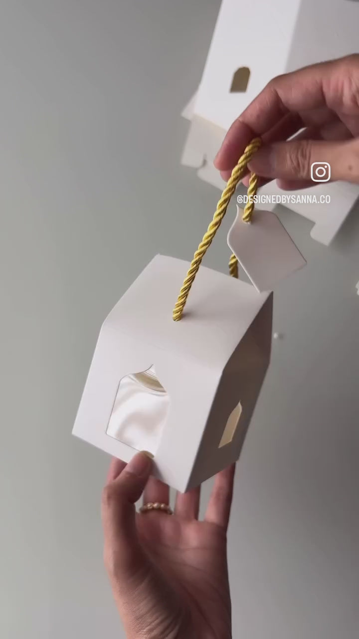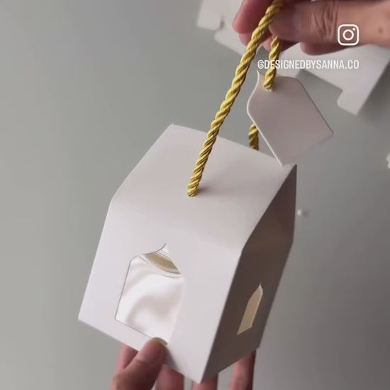 - Set of 10 Boxes: includes 5 box designs x 2 (10 total), 10 gold carry cords, 10 tag matching the doorway and window